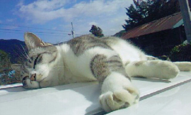 妹の車の上で日向ぼっこしてるアキニャンを写メってもらったので載せる。ウルウルお目目で甘えるアキラもゲロカワ(吐きそうなほど可愛い)ですがこの相手を見下したような半目の不細工面も可愛く見えるのはきっと親の欲目です。